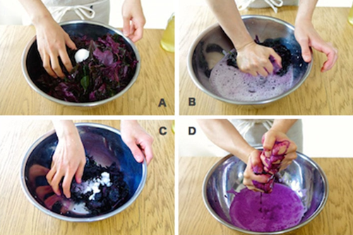 水を切った赤紫蘇の葉に塩「粟国の塩」をふりかけて塩揉みする。