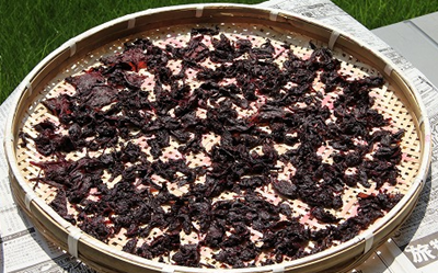 赤紫蘇は皿に広げて、ゴミが付かないように料理で使う水切りザルを上に被せて干した。赤紫蘇は乾くとカリカリになる。(ふりかけに使うゆかりがコレ)