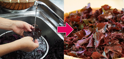 赤紫蘇の葉をちぎって、表面の付着物を取り除く程度で軽く水洗い。